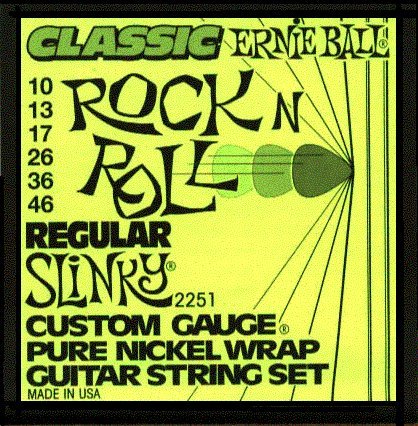 Ernie Ball Electric Guitar Electric, Pure Nickel Wound, Regular Slinky NOTE DESCRIPTION DIAMETER INCHES TENSION LBS 1st E Plain Steel .010 2nd B Plain Steel .013 3rd G Plain Steel .017 4th D Pure Nickel Wound .026 5th A Pure Nickel Wound .036 6th E Pure Nickel Wound .046 Plain String "Plain strings sound the higher pitch notes. Plain string is unwound. Made of specially tempered tin plated high carbon steel, but its shape is round, not hex. Used on electric and acoustic guitars, banjos, mandolins -- not classic guitars. One end has a brass grommet, called a ball, which is secured by a special lock twist. The ball is for attaching the string to an instrument. Electric Strings Wound strings sound the lower pitch notes. They consist of wrap wire lightly coiled around a core wire. Nickel plated steel, the most popular, produces a well balanced all around good sound. Stainless steel provides a brighter sound. Pure nickel, which some believe gives a richer, fuller sound. Plain strings sound the higher pitch notes. They are made of a specially tempered high carbon steel wire. They are used as first, second, and often third strings. Core Wire Core wire is the center of a wound string. It is of specially tempered high carbon steel. The crosscut end view reveals a shape that is not round, but hex shaped. The points of the hex shape help hold the wrap wire securely in place. Hex core wire is used for the wound strings of both electric and acoustic guitars, banjos, and mandolins - but not classic guitars." Sold from Juststrings your source for Guitar Strings and Instrument Accessories.