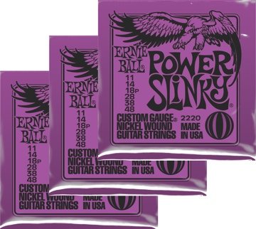 Ernie Ball strings have been a top choice for players of all types since the early 1960s, when guitarists came into Ernie Ball's music store, customizing their string gauges to make their axes easier to play. After fruitless attempts to interest major guitar manufacturers in a lighter set of strings, Ernie Ball decided to start making his own. When you open a pack of his strings today, you know you're getting a quality set of strings designed to give you great tone, reliable performance, and long life. You can't go wrong when you string up with Ernie Ball strings!Ernie Ball's Power Slinky Purple electric guitar strings are made from nickel-plated steel wire wrapped around a tin-plated hex-shaped steel core wire. They offer a great balanced sound that's neither bright nor too dark. Ernie Ball Power Slinky Purple Electric Guitar Strings 3-pack Features at a Glance:3 packs of Power Slinky PurplesType: Electric, 6-string.011, .014, .018p, .028, .038, .048Balanced soundTin-plated hex steel coreNickel-plated steel wrapErnie Ball nickel wound strings make your electric guitar sound and play great!