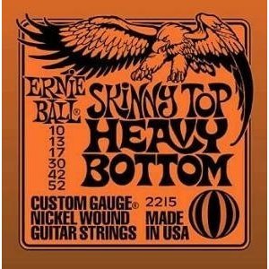 Gauges: 10-13-17-30-42-52. Ernie Ball 2215 Skinny Top/Heavy Bottom Slinky Electric Guitar Strings are the perfect hybrid set for those who like thick bottom strings without sacrificing the ability to solo on smaller strings. The wound strings are made from nickel-plated, steel wire wrapped around a hex-shaped steel core wire. The plain strings are made of specially tempered, tin-plated, high-carbon steel, producing a well-balanced tone for your guitar.All Ernie Ball strings are precision manufactured to the highest standards and the most exacting specs to assure consistency, optimum performance, and long life.Ernie Ball is a pioneer of rock and roll guitar strings. Jimmy Page, Eric Clapton, Steve Vai, and Slash are among the long list of Slinky players.
